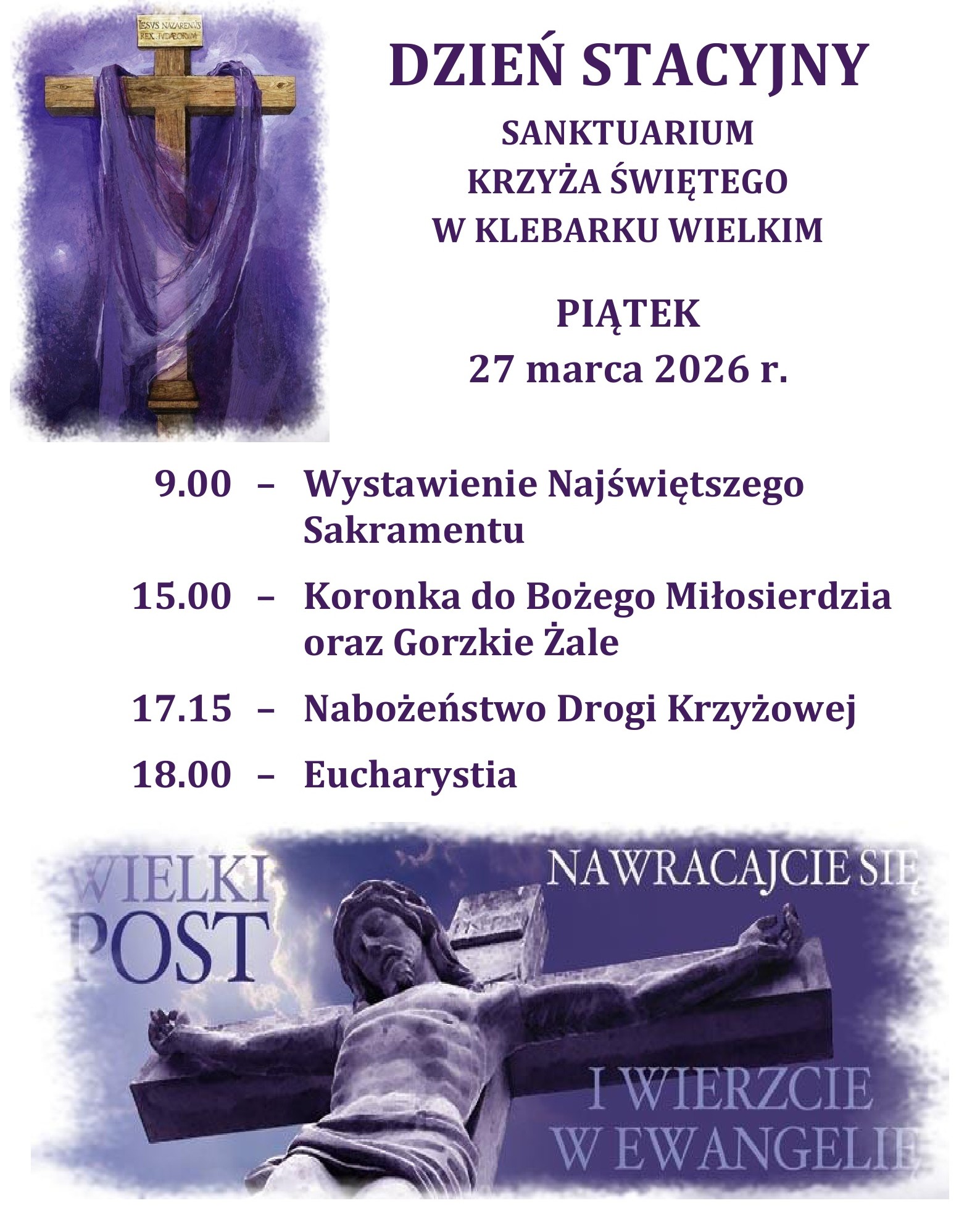 - W najbliższy piątek (27.03) w naszym sanktuarium Wielkopostny Dzień Stacyjny. Adoracja Najświętszego Sakramentu od godz. 9.00.