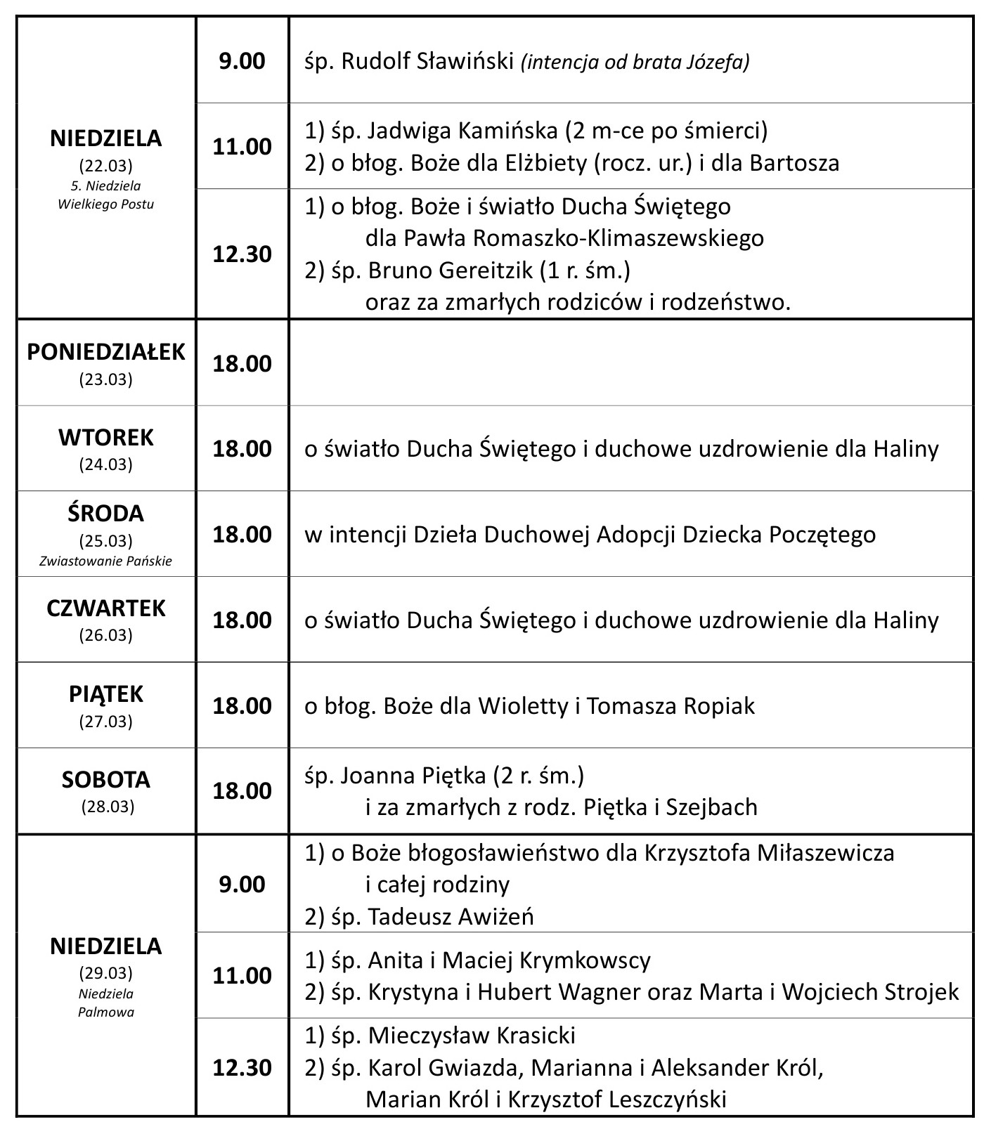 - W środę (25.03) Uroczystość Zwiastowania Pańskiego i dzień patronalny Dzieła Duchowej Adopcji. Zapraszamy na mszę świętą o godz. 18.00.