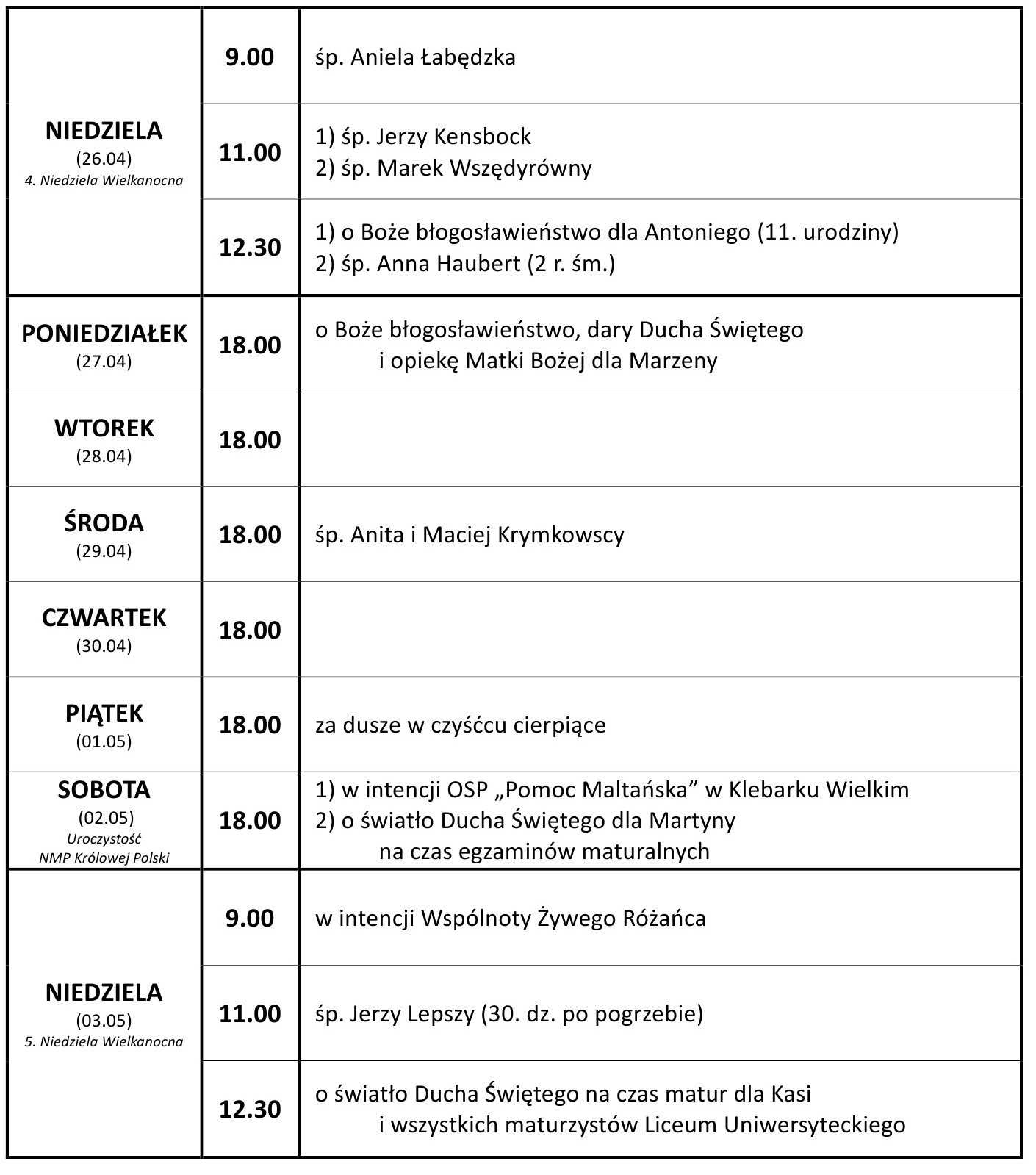 - Od piątku rozpoczynamy nabożeństwa majowe. W dni powszednie o 17.30, w niedzielę – po mszy św. o godz. 9.00.