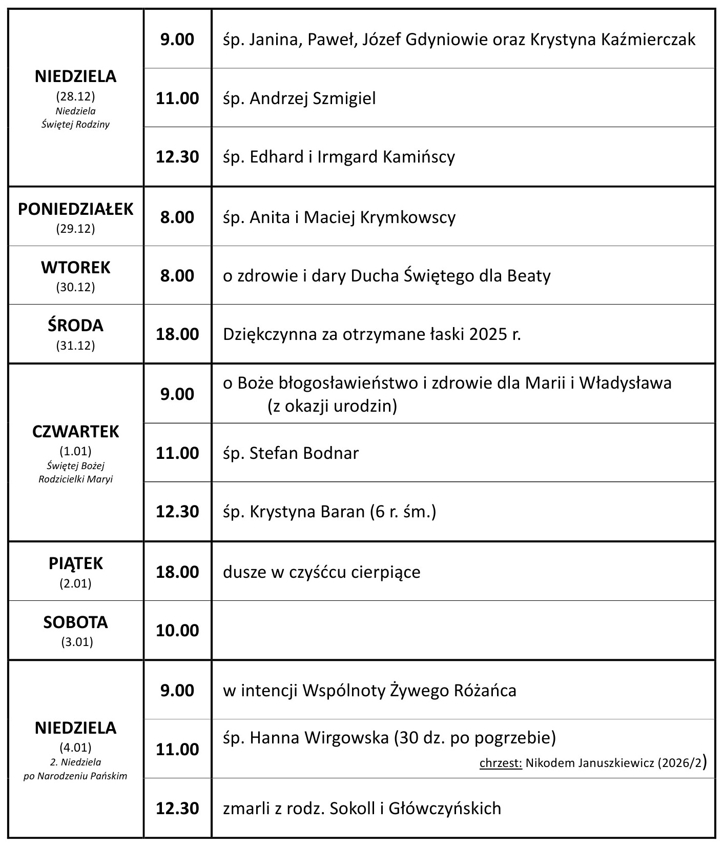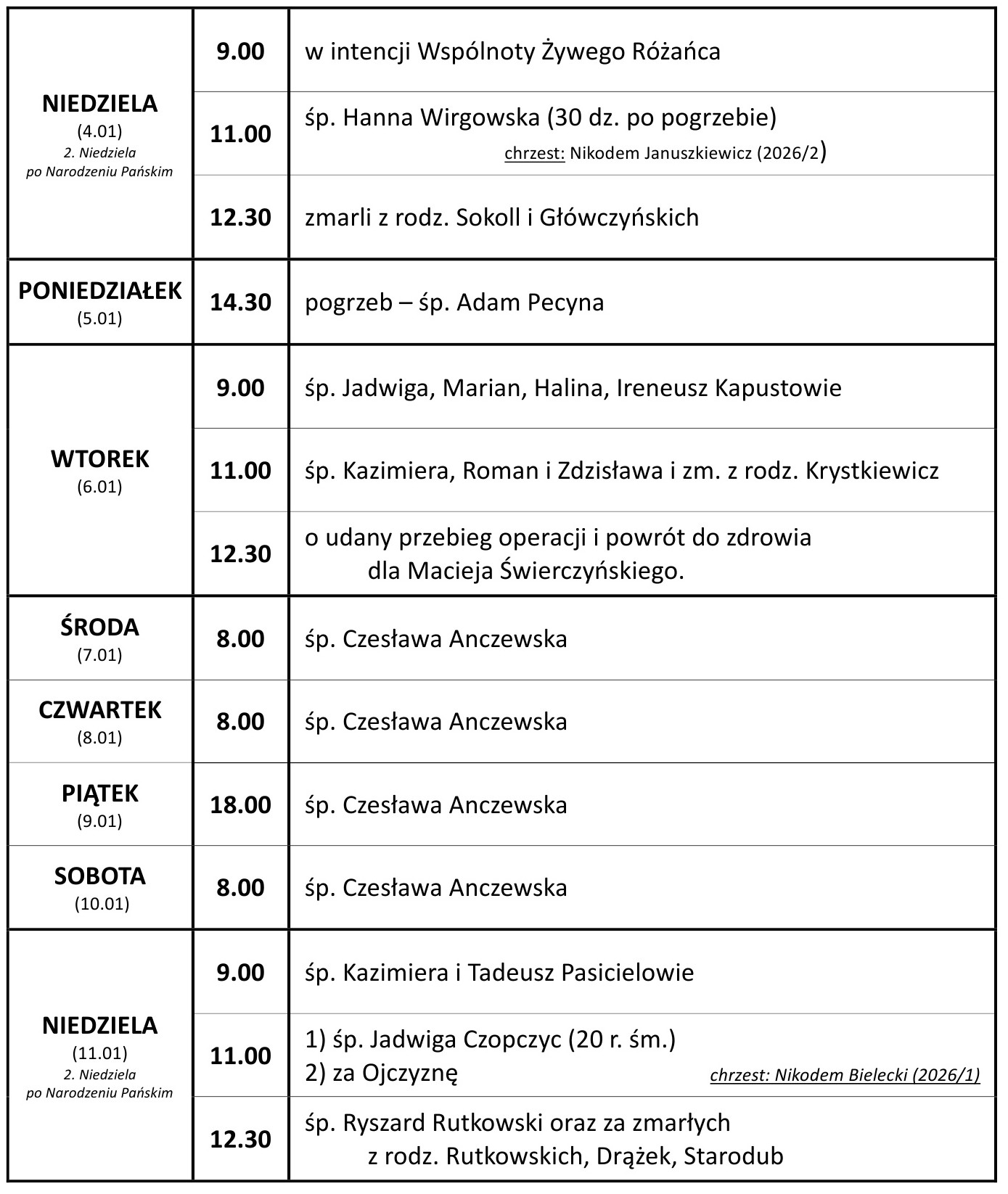 Intencje mszalne (04.01.2026 – 11.01.2026)