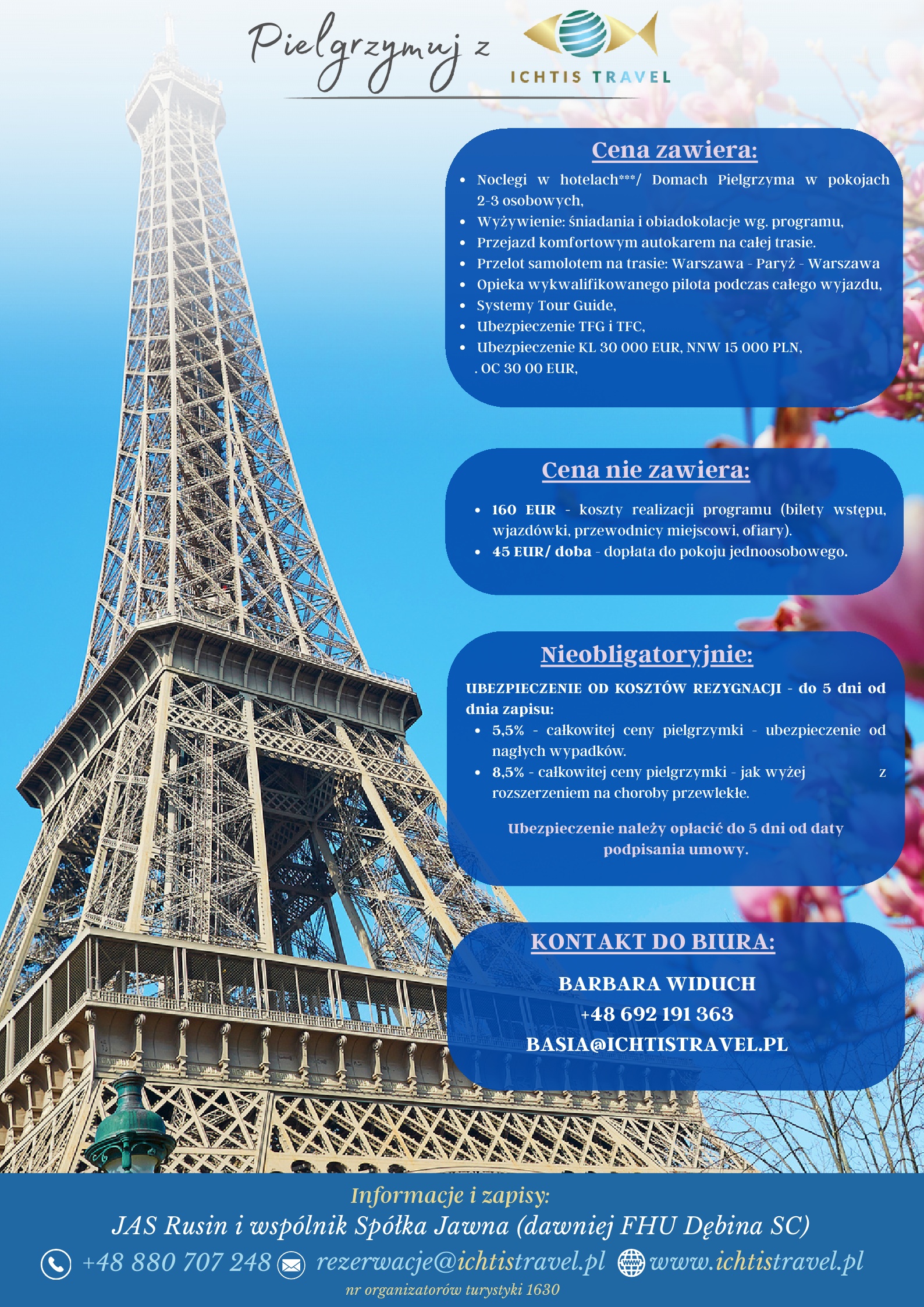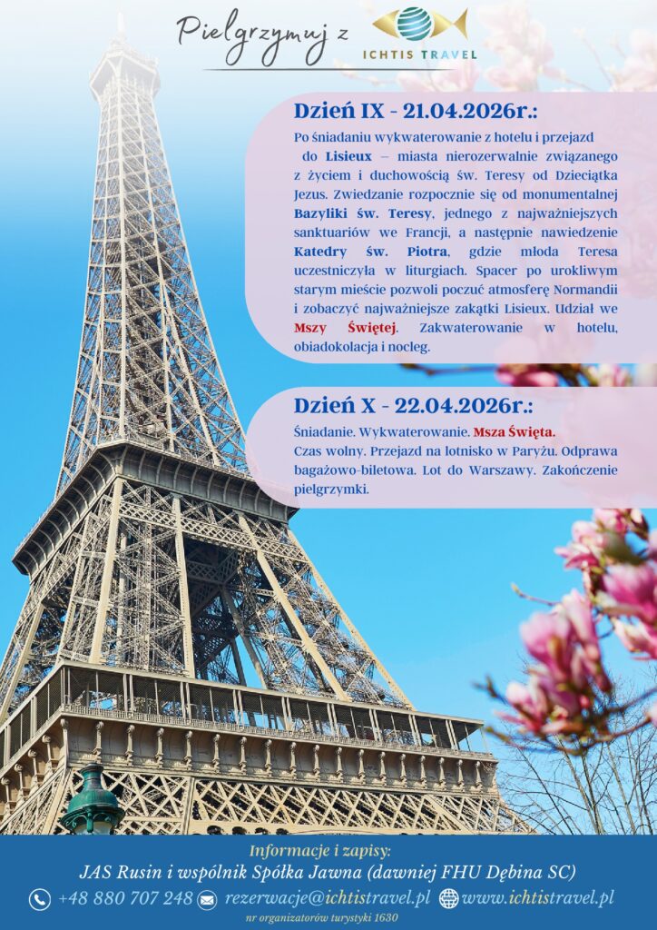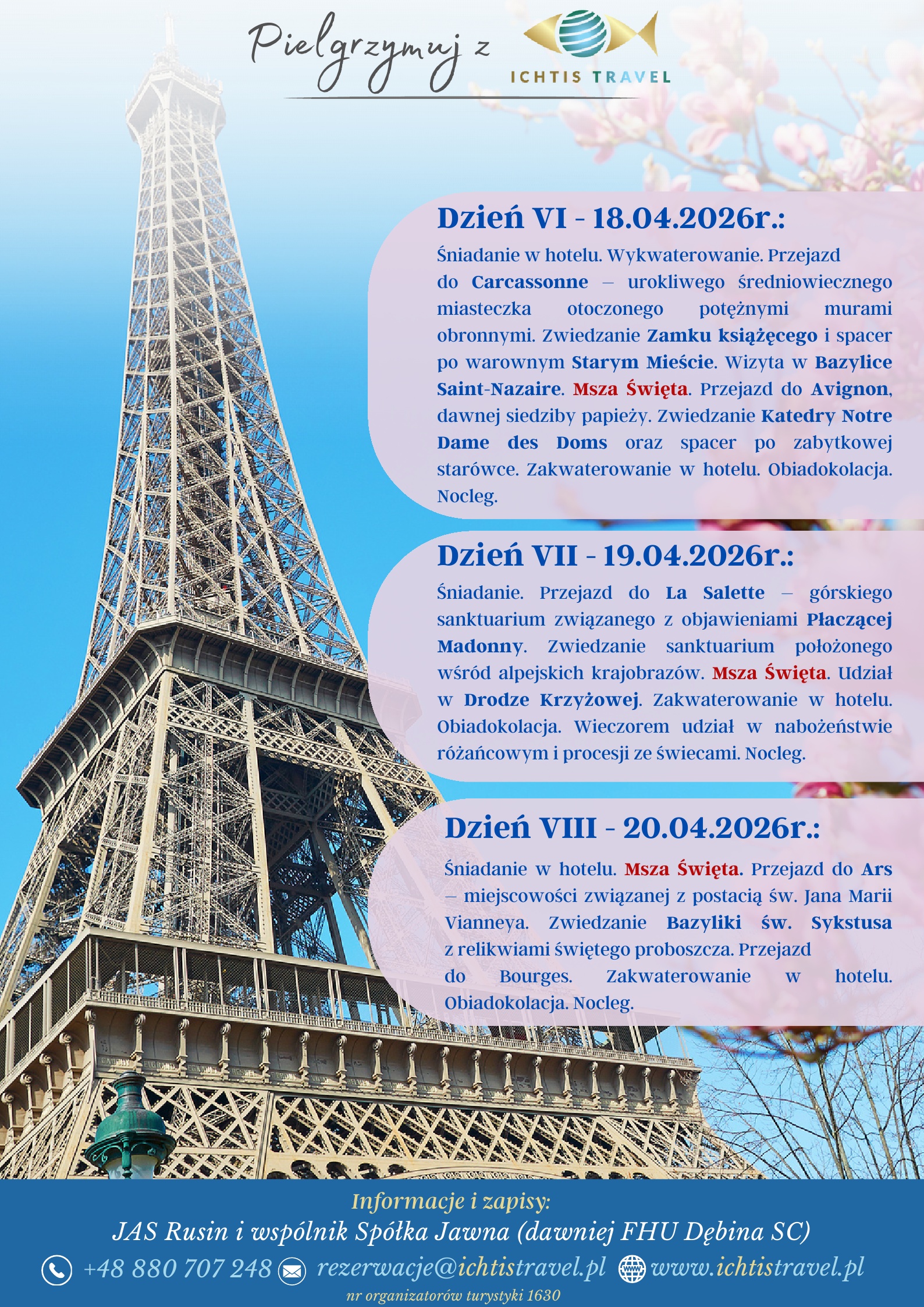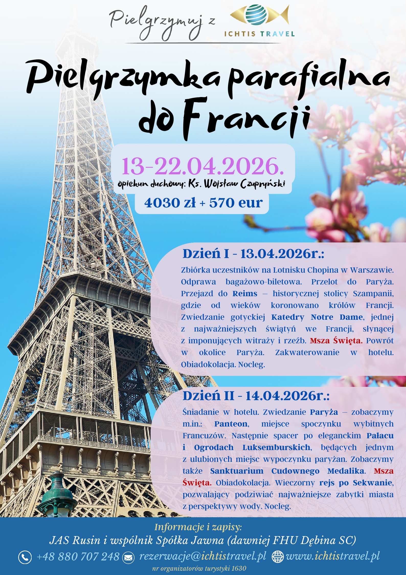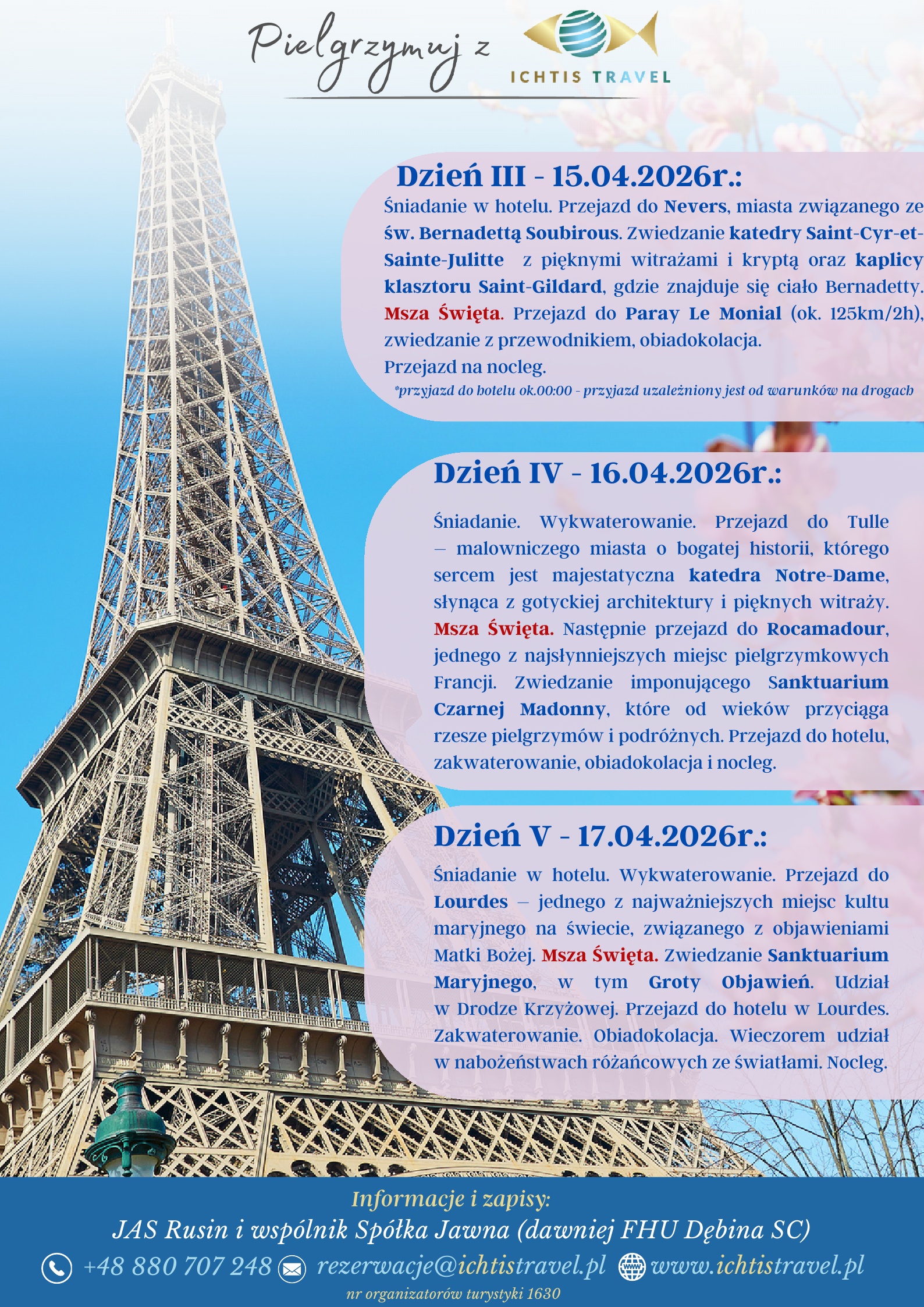 - Przypominam, że w przyszłym roku w terminie 13-22.04.2026 r. organizujemy pielgrzymkę do Francji. W ciągu 10 dni, odwiedzimy wszystkie najważniejsze sanktuaria i miejsca święte. Koszt ok. 7.500 zł. Szczegóły program wyjazdu na stronie: parafiaklebark.pl.
