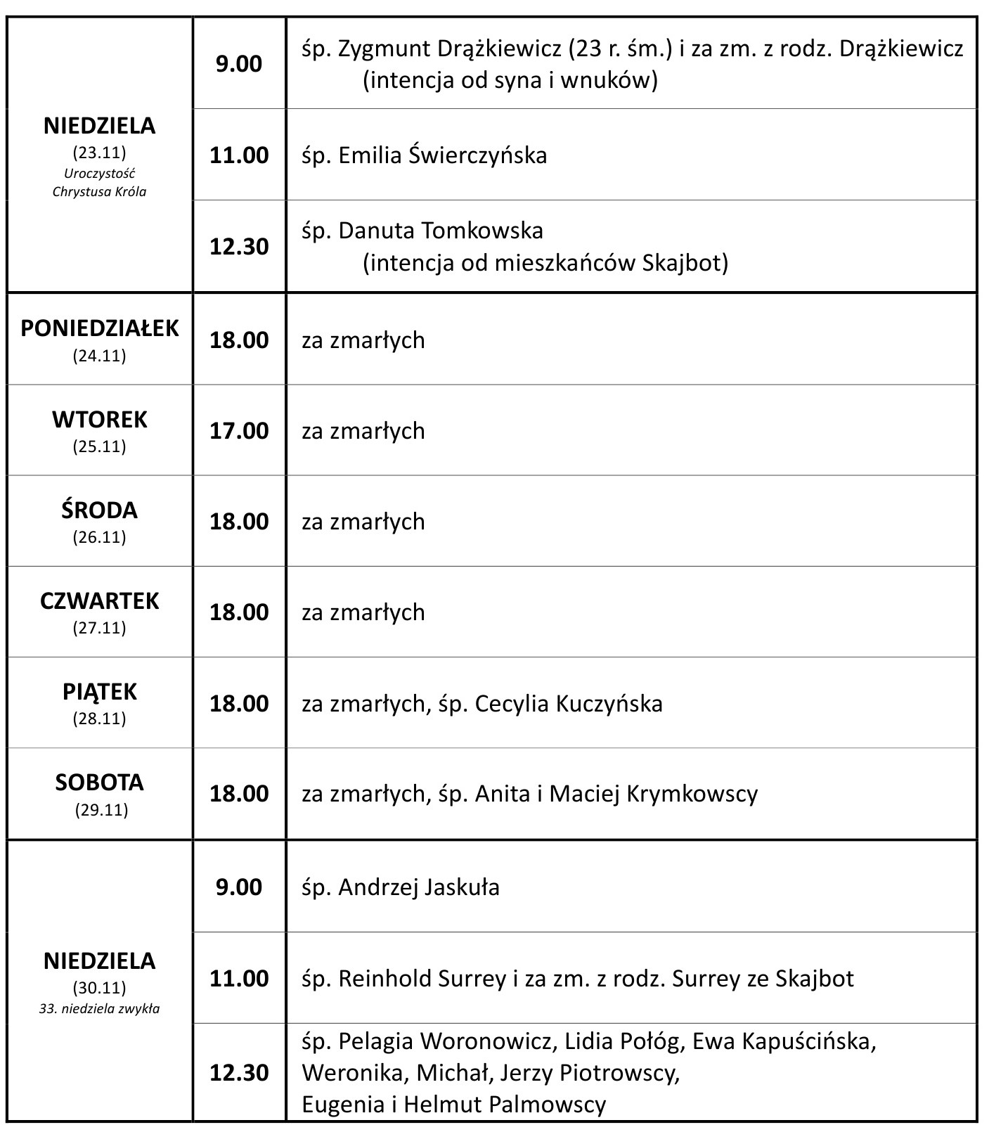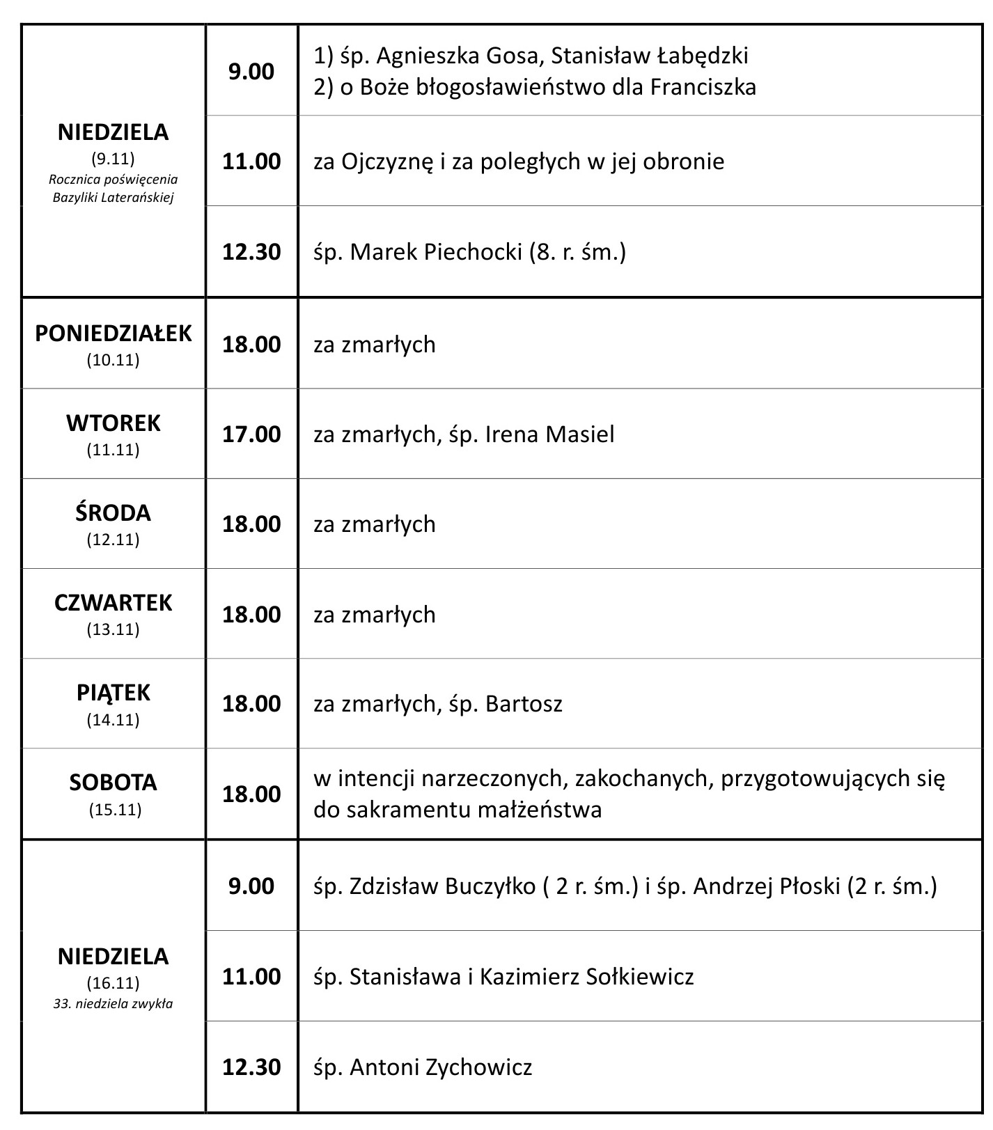 - Przez cały listopad msza św. w intencji naszych zmarłych o godz. 18.00. O 17.45 wypominki i Koronka do Bożego Miłosierdzia.