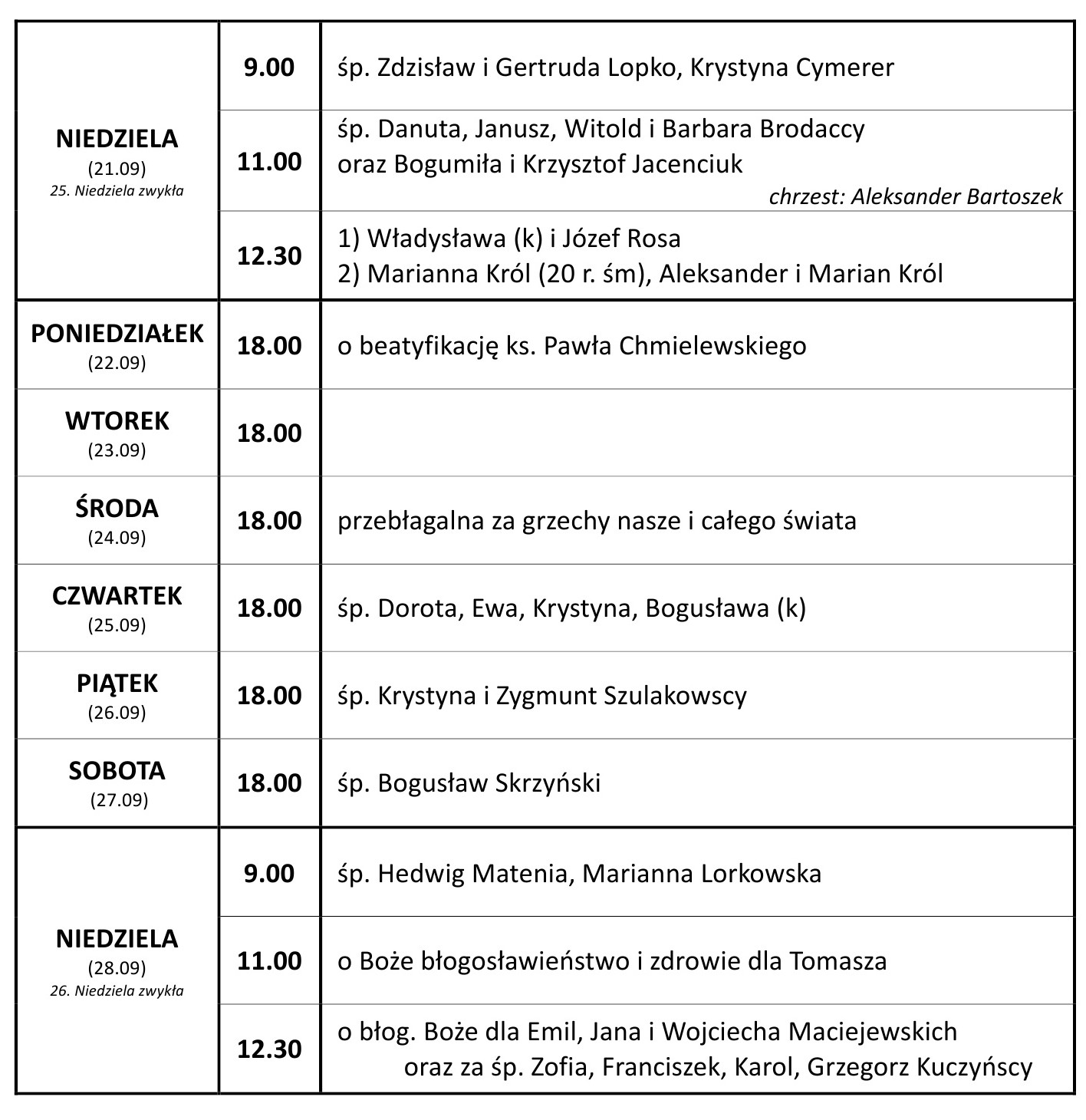 - Za dwa tygodnie w sobotę (27.09) w naszej parafii dzień skupienia, który rozpocznie się o 9.00 i potrwa do wieczora. Temat: „Jak pokochać siebie, drugiego człowieka i Boga”. Koszt udziału 60 zł. (to nie jest warunek uczestnictwa). Uwaga! Będzie też potrzebne swoje zdjęcie z najwcześniejszego dzieciństwa. Zapisy u p. Marylki Piórkowskiej, p. Agnieszki Miłaszewicz lub u ks. proboszcza.