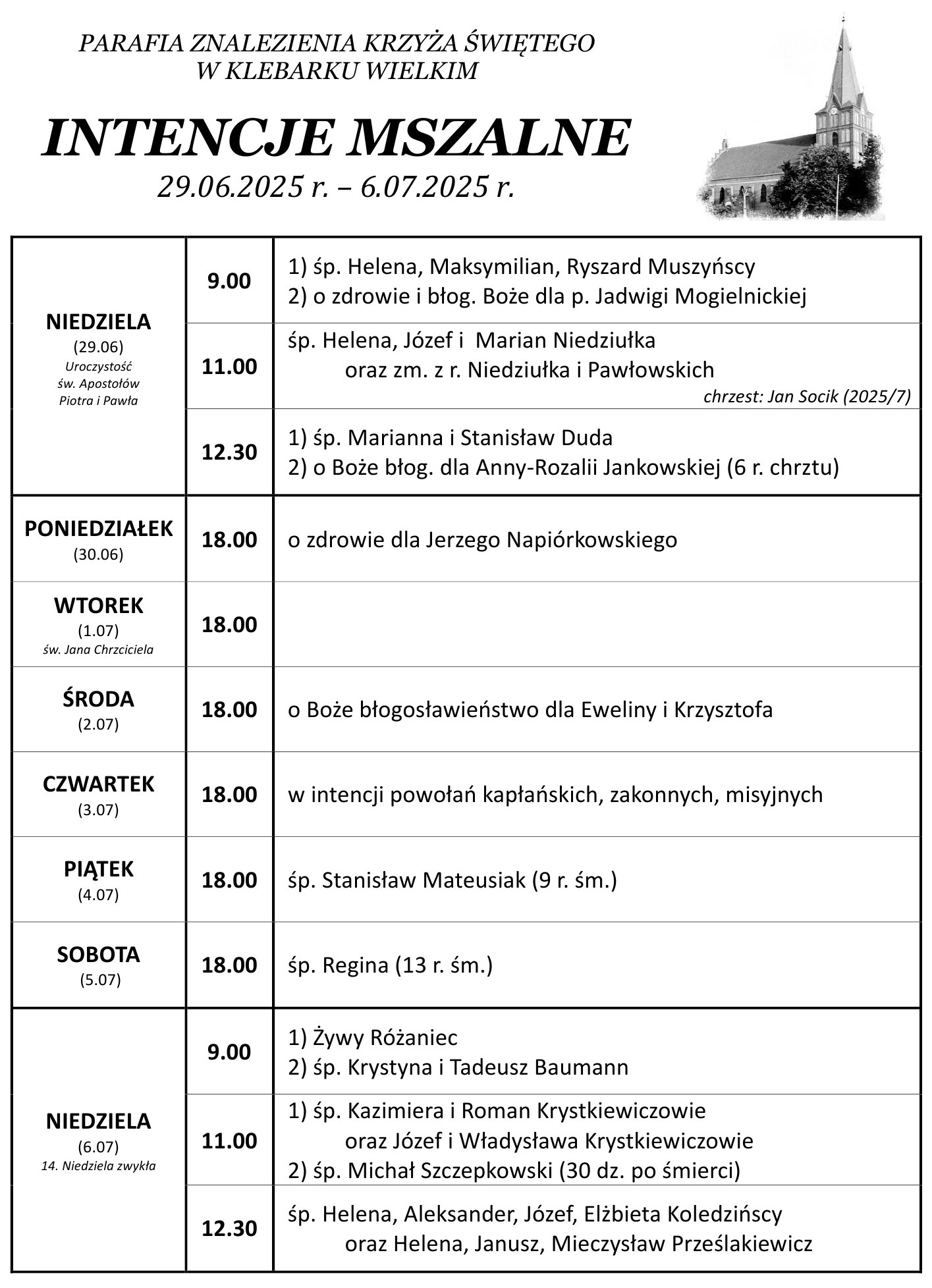 - W przyszłą niedzielę o godz. 9.00 msza święta w intencji beatyfikacji ks. Pawła Chmielewskiego. O 12.30 równolegle dwie msze święte: pierwsza w kościele w Klebarku, druga – odpustowa w naszej kaplicy w Skajbotach (z racji przypadającej niebawem Uroczystości Najświętszego Serca Pana Jezusa).